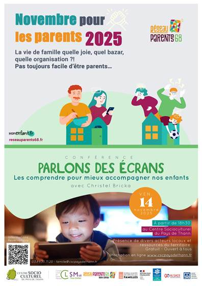 Pour vous inscrire : Parlons des écrans | Novembre pour les parents 2025 | Agenda des événements – CSC Pays de Thann – ou le QR code de l’affiche
