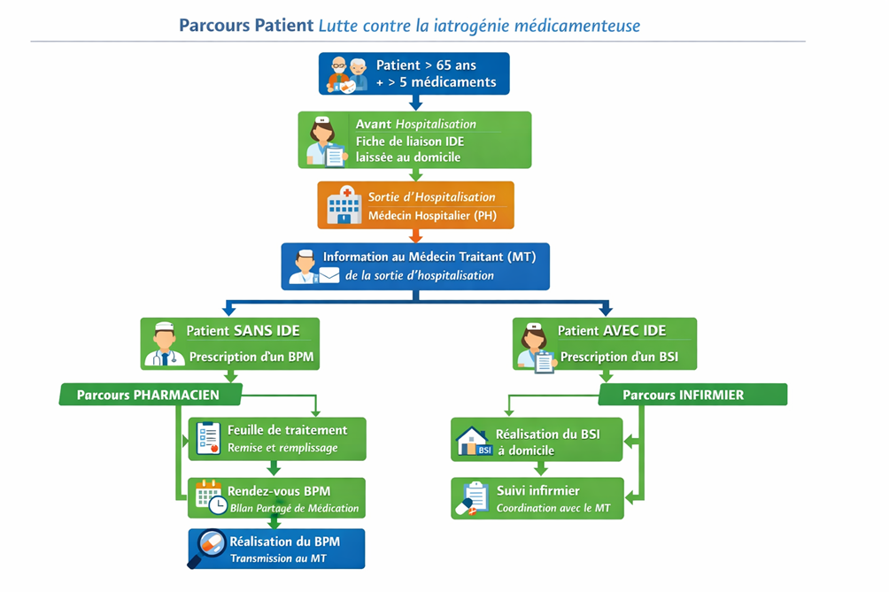 La CPTS Thur Doller a développé un parcours de soins dédié à la prévention de la iatrogénie médicamenteuse, ciblant les patients de plus de 65 ans prenant plus de 5 médicaments (principes actifs). Ce parcours vise à améliorer la coordination entre professionnels de santé, renforcer la sécurité des prescriptions et favoriser la réalisation de bilans de médication (BPM).